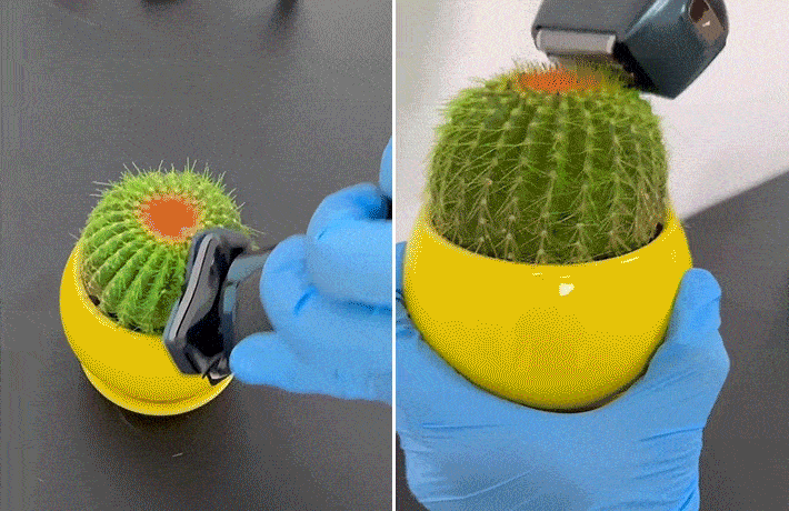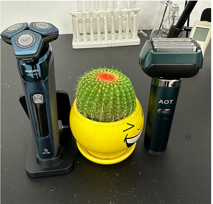 为了上面实验结果,用旋转式剃须净度最高的飞利浦,和往复式剃须净度最高的AOT进行“仙人球”对比测试。