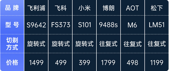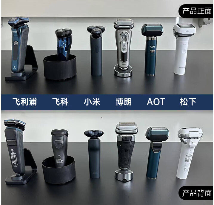 电动剃须刀主要分为旋转式和往复式两种类型,外观上有较大区别。旋转式多为三个圆刀网设计,往复式多为横刀网设计。至于两者之间的区别,我们将在接下来的评测部分详细介绍。先有请本次6位选手上台。
