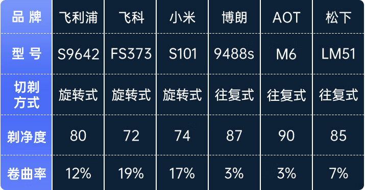 6个品牌均符合剃须刀国家标准的卷曲度(小于30%),剔净度(大于70%)要求,但是如果以更高的标准来看,往复式类型的剃须刀切面更整齐,卷曲率更低,剔净度明显高于旋转式。