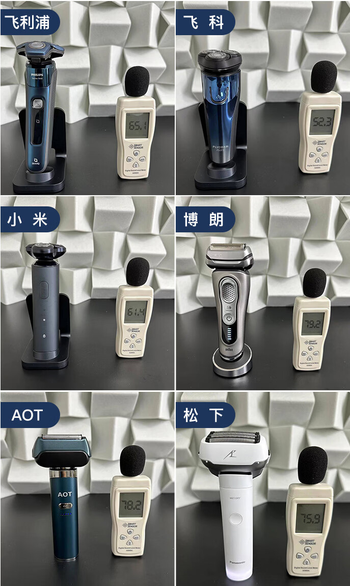 我们采用分贝仪对各品牌进行测试,得出结果如下,这次实测的6个品牌都能达到国家标准,噪音最少的为飞科,噪音最大是博朗。