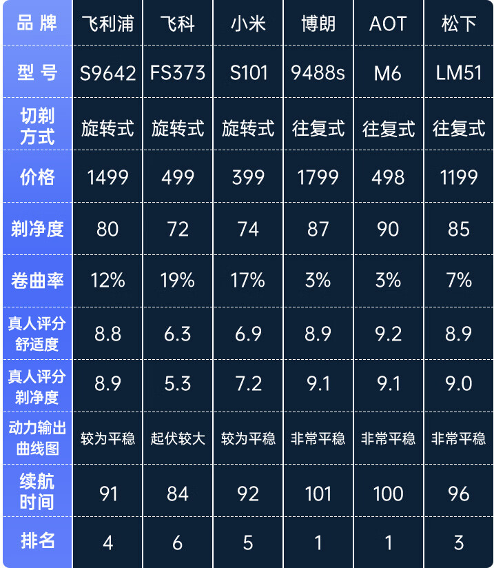 本次评测,我们在京东平台上,依据各品牌的销量、口碑、品牌力等维度,精挑排名靠前,具有广泛代表性的6款旗舰级电动剃须刀进入本次评测,考核维度如下: